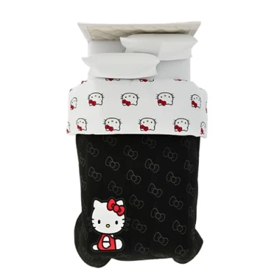 ITEM INCLUDES: Reversible designed comforter measures 64" (W) x 86" (L) and designed to fit a twin size bed. EASY CARE: You can throw the comforter into the washer and dryer without worrying about the colorful themed pattern and animated cartoon characters fading or the need for ironing. The material is wrinkle-resistant making it a great choice for any child's bedroom or nursery as a cute home decor accessory. SUPER SOFT COMFORTER: Crafted for comfort, the microfiber material is super soft and long lasting, keeping kids warm and cozy all night or while camping. This high-quality comforter is an enduring choice that is sure to become a favorite in any collection. HELLO KITTY DESIGN: Embrace the charm of Hello Kitty with a twin reversible comforter. One side boasts Hello Kitty sitting against a chic black background adorned with faded bows, while the other side showcases an enchanting all-over print of Hello Kitty's adorable face. A delightful addition to any bedroom!