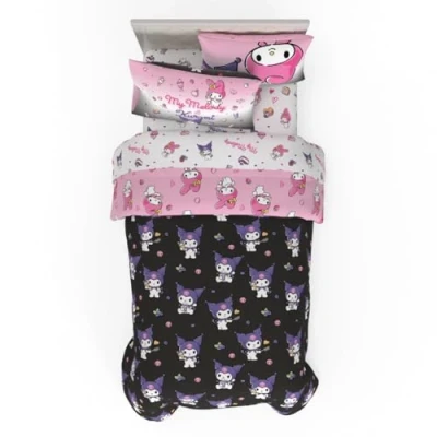5 PIECE TWIN SIZE COMPLETE LINEN SET INCLUDES: 1 fitted sheet 39" (W) x 75" (L). 1 flat sheet 66" (W) x 96" (L). 1 standard pillow case 20" x 30". 1 pillow sham 26" x 20". 1 reversible comforter 64" (W) x 86" (L). Designed to fit a standard twin size bed. SUPER SOFT EASY CARE BED IN A BAG: Crafted for comfort, the microfiber material is super soft and long lasting, keeping you warm and cozy all night or while camping. This high-quality bed set is an enduring choice that's sure to become a favorite. TWO DESIGNS IN ONE COMFORTER: This reversible comforter lets you flip between two iconic Sanrio besties! One side features a bold black backdrop with an allover Kuromi print, while the reverse is sweet and playful with My Melody surrounded by hearts on pink. Switch it up anytime for a fun and stylish refresh! EASY CARE: You can throw the bedding set into the washer and dryer without worrying about the color fading or the need for ironing. The material is wrinkle-resistant making it a great choice for you bedroom. KUROMI & MY MELODY DESIGN: Flip between sweet and sassy with this reversible comforter! One side features My Melody with hearts on pink, and the other showcases Kuromi on black. Coordinating sheets complete the look for a fun and cozy Sanrio-inspired bedroom!