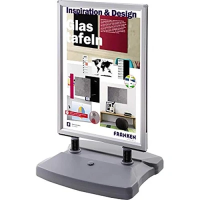 A1 free standing double sided poster stand ideal for marketing purposes such as promotions and advertising, as well as for displaying posters, notes and information. Freestanding, double-sided poster stand for indoor and outdoor use with practical aluminium folding frame technology for a professional impression and easy poster changes. The aluminium folding frame has an anti-reflective PP cover, is easy to clean and protects against dirt and dust. Two steel spirals provide more flexibility, fillable plastic base with two castors Box contents: Franken poster stand A1 with folding frame, size (W x H x D): 67 x 112.3 x 59 cm, silver, BS1304