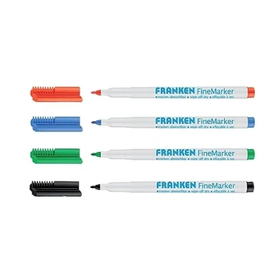 Ideal for dry erase Franken planning boards and for labelling magnetic planning board accessories Box contents: 4 x Franken fine markers, assorted colours, Z1994 Ideal for Franken planning boards and for labelling magnetic planning board accessories The 1-2 mm fine, round standard tip creates even, smooth lines and is the ideal writing tool for Franken whiteboards