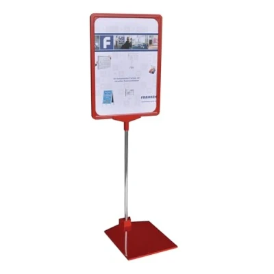 Price stand with coloured plastic frame in A3 format, can be used in portrait or landscape format Can be used on both sides, includes protective film Metal standpipe, infinitely height adjustable from 32 to 62 cm. Coloured plastic coated metal base Box contents: 1 x Franken information stand A3, 297 x 620 x 10 mm, red, PSM A3 01