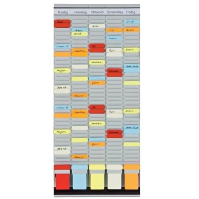 FLEXIBLE PLANNING The arrangement of the months or days of the week you choose yourself with the easily interchangeable T-cards, so you can start planning whenever you want. Can be used as a tour planner, occupancy planner, project planner or weekly planner, size: 31.5 x 78 cm All included T-cards are certified with the Blue Angel according to UZ59 Individual T-card holders made of light grey plastic are fixed by the connecting profiles Box contents: 5 brackets with 35 slots each, 1 set of connection profiles, 500 T-cards size 2, assorted colours, 5 card holders for size 2, mounting material (screws and dowels)