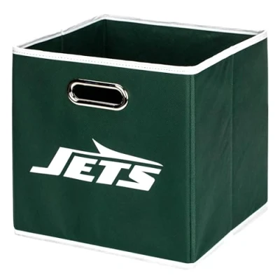 NEW YORK JETS STORAGE BIN: This collapsible fabric storage container is the perfect addition to any fan's office, bedroom, or man cave to stay organized and show some team pride! DURABLE CONSTRUCTION: These non-woven polyester fabric bins are built to last, easy to wipe down, and fold flat when not in use so they're easy to store! FUNCTIONAL DECOR: Bins include a reinforced chrome handle that is both stylish and functional making it easy to carry and move around! FITS CUBE ORGANIZERS: These storage bins measure 11" x 10.5" x 10.5" to fit into most cube organizers MULTI-USE: You can store toys, magazines, clothes, supplies, and more with ease, which makes these bins a great gift for any football fan!