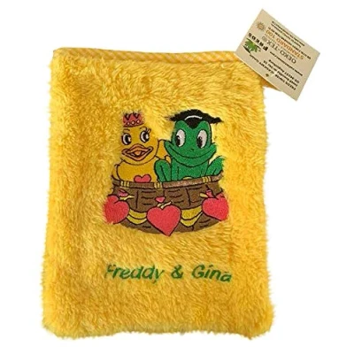Washing Mitt for Babies and Toddlers Cute embroidered Fred the Frog and Gina the Duck Size: Approx. 16 x 20 cm Top binding and hanging loop Made from fluffy yellow Welsoft polyester, machine washable