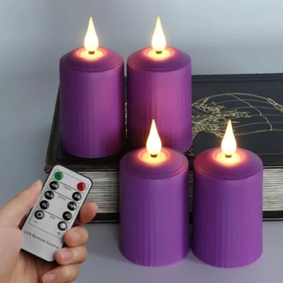 FREEPOWER 4 Purple LED Candles Flickering with Remote Control and Timer Battery Operated Flameless Pillar Warm White Advent Decoration, 350+ Hours, Diameter 5x10.5cm