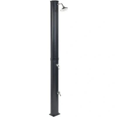 General description This sleek, freestanding outdoor shower is made from durable materials and is solar-powered for an eco-friendly experience. It’s designed to provide a refreshing rainfall-like flow of water, offering both relaxation and practicality in your outdoor space. The shower also features a feet-washing tap, making it easy to clean up before entering the pool. Perfect for gardens or patios, this modern shower combines high-quality materials with sustainable energy, ensuring both style and functionality. Easy to install and maintain, it’s the ideal addition for any outdoor retreat. Technical specifications Product Type: Outdoor Shower Style: Modern General Color: Black Main Material: PVC Additional Material: Zinc Finish: Gloss Capacity: 35 liters Dimensions: Depth: 15 cm, Width: 18 cm, Height: 217 cm Weight: 9 kg Installation Requires installation with 4 anchoring screws (included) to a hard and flat surface (e.g., cement or tile flooring). Access to the water supply system