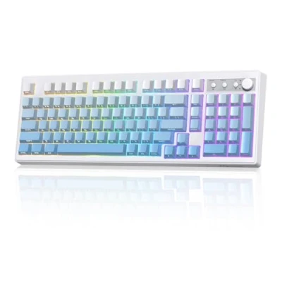Tri-mode Connection Keyboard: @@@HRIt2652yHe/TTbFyUKFKZB4QGAEEIZF@@@ K100 membrane keyboard supports Bluetooth, 2.4GHz wireless and USB wired tri-mode connection. It can connect up to 5 devices simultaneously and switch quickly, compatible with MAC, Windows systems to meet diverse usage needs PBT Gradient Side-Engraved Keyboard: K100 mac keyboard features popular PBT gradient keycaps with two-color injection molding. Side-engraved characters are translucent, stylish and durable. Its 102-key compact layout saves desktop space while supporting 26-key anti-ghosting for smooth operation 16 Million RGB Backlit Keyboard: K100 RGB full keyboard is equipped with 16 million RGB lighting colors and multiple dynamic effects. The backlight can be switched and adjusted for brightness via the knob or the key combination, adding atmosphere to work and entertainment. It can be turned off when not needed Long-Lasting Battery & Smart Power Saving: This rechargeable keyboard has a 4000mAh large-capacity battery. Wireless mode: backlight off/sleep after 2 mins idle, deep sleep (disconnect) after 30 mins. Wired mode: sleeps with the computer. Wake up by pressing any key easily Multi-function Knob & Media Keys: FREEWOLF K100 has a multi-function knob: adjust volume clockwise/counterclockwise, press to mute. It also switches backlight and adjusts brightness. Equipped with media keys (forward/back, prev/next track, play/pause) for convenient operation