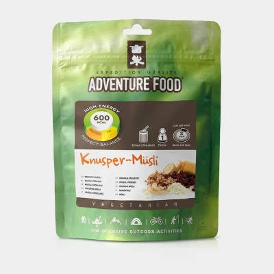 Adventure Food Crunchy Muesli, lightweight dried food with a long shelf life. Just add cold water! Perfect for backpacking, this meal is quick and easy to make and won't take up much room in your pack.