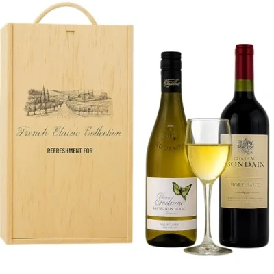🍷 A refined French Classic Wine Gift Set featuring a crisp Goulaine Sauvignon Blanc and a rich Château Mondain Bordeaux, presented in a luxurious double wooden box. 🍇 Goulaine Sauvignon Blanc offers bright citrus, green apple, and gooseberry notes with crisp acidity and a clean, refreshing finish — classic French elegance in a glass. 🍒 Château Mondain Bordeaux delivers ripe red fruit, oak spice, and silky tannins for a smooth, balanced red with the depth and character of traditional Bordeaux. 🎁 Beautifully presented in a handcrafted double wooden box, this premium wine duo makes an ideal gift for birthdays, anniversaries, weddings, or festive celebrations. 🍽️ Perfect for pairing with seafood, poultry, or cheese boards — a timeless French red and white collection that embodies sophistication and taste.