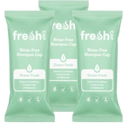 FreshWipes Ocean Fresh Shampoo Cap Pack of 3 No Rinse for Elderly or Disabled Cleanses & Conditions Shower Access, Camping Festival Use Dermatologically Tested
