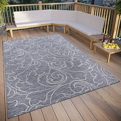 freundin Home Collection Palau Indoor & Outdoor Rug Floral Flat Weave Leaf Pattern, Weatherproof UV Resistant for Living Room, Hallway, Balcony, Patio, Garden Grey, 77 x 150 cm