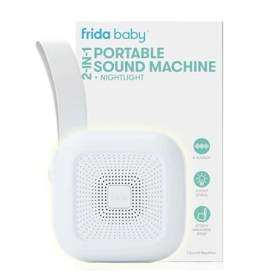 Frida Baby 2 in 1 Portable Sound Machine, White Noise Machine for + Night Light with 5 Soothing Sounds & 3 Nightlight Model, Travel Attaches to Buggies, Car Seats and Cots