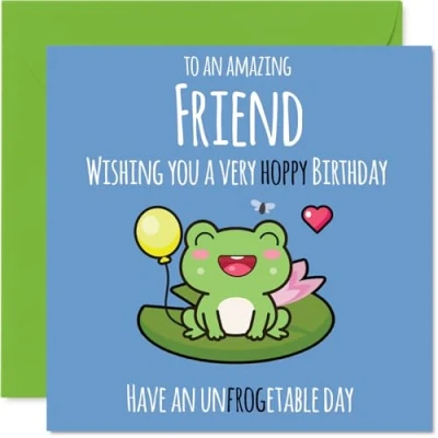 MAKE YOUR FRIEND SMILE WITH THIS UNIQUE BIRTHDAY CARD: This exceptional quality Friend birthday card shows the design 'To an amazing Friend Wishing you a very hoppy birthday. Have an unfrogetable day'. If you are looking for a beautiful birthday card Friend, then then this happy birthday Friend card is bound to make them smile. Not just a birthday card for Friend this could also be a birthday gifts for Friend, Best Friend or Bestie. WHAT DO YOU GET: The card is printed on one side and BLANK ON THE INSIDE to allow you to write your very own message. The unique fun design is printed on a specially sourced and environmentally responsible board. At 360 microns thick the natural white one-sided gloss board has a quality look and feel. Supplied with a coloured gummed envelope to complement the design and ready to be sealed and sent in the post. Friend Bday cards, Best Friend birthday cards, Bestie birthday card. NO INK SMUDGES: There is nothing worse than writing inside a card to find that the shiny surface makes the ink smudge. This is why we use a high quality one sided coated board. The uncoated side will absorb more of the ink from your pen to make smudging a thing of the past. Friend birthday cards, Friend birthday cards from Best Friends. SIZES: Greeting Card = 145mm x 145mm, Envelope = 155mm x 155mm, Card Thickness = 360 micron. Happy birthday Friend, Friends birthday card, Friend cards birthday, birthday card Friend, happy birthday Friend card, Friend gifts from Best Friends. MADE AND QUALITY CHECKED IN THE UK: We print and manufacture all our products right here in the UK so you can be sure of a fast turnaround and a product that is expertly made. Using environmentally responsible premium board our card is conscious of the responsible management of the world's forests - happy birthday card Friend, Friend birthday cards.