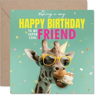MAKE YOUR FRIEND SMILE WITH THIS UNIQUE BIRTHDAY CARD: This exceptional quality Friend birthday card for her shows the design 'Wishing a very Happy Birthday to my super cool Friend'. If you are looking for a beautiful birthday card Friend for her, then then this happy birthday Friend card is bound to make her smile. Not just a birthday card for Friend this could also be a birthday gifts for Friend, Best Friend or Bestie. WHAT DO YOU GET: The cards are printed on both sides with the inside print saying 'Have an Amazing Day' and ample space for your own personal message. The unique fun design is printed on a specially sourced and environmentally responsible board. At 360 microns thick the natural white one-sided gloss board has a quality look and feel. Supplied with a coloured gummed envelope to complement the design and ready to be sealed and sent in the post. NO INK SMUDGES: There is nothing worse than writing inside a card to find that the shiny surface makes the ink smudge. This is why we use a high quality one sided coated board. The uncoated side will absorb more of the ink from your pen to make smudging a thing of the past. Friend birthday cards, Friend birthday cards from Best Friends. SIZES: Greeting Card = 145mm x 145mm, Envelope = 155mm x 155mm, Card Thickness = 360 micron. Happy birthday Friend, Friends birthday card, Friend cards birthday, birthday card Friend, happy birthday Friend card, Friend gifts from Best Friends. MADE AND QUALITY CHECKED IN THE UK: We print and manufacture all our products right here in the UK so you can be sure of a fast turnaround and a product that is expertly made. Using environmentally responsible premium board our card is conscious of the responsible management of the world's forests - happy birthday card Friend, Friend birthday cards.