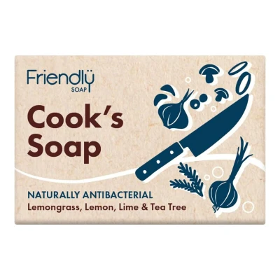 Friendly Soap Cook’s Soap is a natural, antibacterial bar made for cooks to eliminate tough kitchen odors using bicarbonate of soda, tea tree oil, and lemongrass. Vegan, cruelty-free, and eco-friendly—free from palm oil, preservatives, and plastic—for clean hands and a sustainable choice.