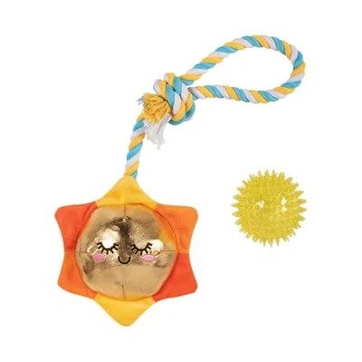𝗜𝗻𝘁𝗲𝗿𝗮𝗰𝘁𝗶𝘃𝗲 𝗦𝘂𝗻-𝗦𝗵𝗮𝗽𝗲𝗱 𝗗𝗼𝗴 𝗧𝗼𝘆: Features a fun design with a cheerful sun face — perfect for playtime, tugging, and chewing. 𝗦𝗾𝘂𝗲𝗮𝗸𝘆 & 𝗦𝗽𝗶𝗸𝘆 𝗧𝗣𝗥 𝗕𝗮𝗹𝗹 𝗜𝗻𝘀𝗶𝗱𝗲: Includes a spiky textured TPR squeaky ball that encourages play and helps support dental stimulation. 𝗖𝗿𝗶𝗻𝗸𝗹𝗲 𝗣𝗮𝗽𝗲𝗿 𝗳𝗼𝗿 𝗘𝘅𝘁𝗿𝗮 𝗙𝘂𝗻: Built-in crinkle material keeps dogs engaged and adds exciting sounds during play. 𝗧𝘂𝗴𝗴𝗮𝗯𝗹𝗲 𝗥𝗼𝗽𝗲 𝗔𝗿𝗺𝘀: Durable rope sections make it great for games of tug-of-war and interactive bonding time. 𝗜𝗱𝗲𝗮𝗹 𝗳𝗼𝗿 𝗔𝗹𝗹 𝗗𝗼𝗴 𝗦𝗶𝘇𝗲𝘀: With dimensions approx. 15.5" H x 5.5" W x 3.25" D, this toy suits small, medium, and large dogs.