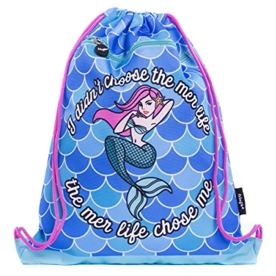 KIDS AND TEENS DRAWSTRING BAG: Perfect for all purposes, this Fringoo drawstring bag is big enough to carry everything you could possibly need in the busy life of a young person. Whether kid, tween, or teen - whether swimming, sleeping overnight, or heading off to football or dance training, a large drawstring bag is what you need to show off your style in bright colour. Available in a variety of cool designs, our range is designed with all kinds of kids in mind. MER-LIFE DESIGN: This sassy slogan says it all - indulge your mermaid fantasy with this drawstring bag and let everybody see your mermaid style! If you're looking for gifts for a little princess mermaid in your life, or simply love the deep blue sea and all creatures within it, this bag is your perfect match. Featuring large mermaid with pink hair on a pastel mermaid tail background. LARGE CAPACITY AND USE: Large enough to fit all of your holiday essentials or school supplies, this drawstring bag is big enough to fit your every need. The zipped front pocket works well for shoe storage, for use as a beach bag, gym bag, or kids swim bag. Adventurers of all shapes and sizes, this is a backpack that can fit your needs! The soft form material makes this bag perfect for carrying small or large amounts without bulkiness, and works especially well for days out and travel. DURABLE STRONG MATERIALS: Made from polyester that's tough and strong, soft to the touch, and super lightweight, this bag is perfect for young people who love to explore and play. The large capacity is big enough to hold everything kids need for day to day use, and the zipped front pocket provides security and extra space. Adjustable cord straps and drawcord closure are simple and safe for kids of all ages and provide easy, quick access for kids and parents on the go. DRAWSTRING BAGS IN ALL AESTHETICS: Whether you're unicorn obsessed, a dino-loving dude, or a wannabe superhero, there is something in this Fringoo range of drawstring bags for you. Created with kids, tweens, and teens in mind, we cater to all individual styles and personalities, offering kids the opportunity to express themselves through their accessories. Shop the full range of drawstring bags and find your perfect travel bag, swimming bag, overnight bag, and more!