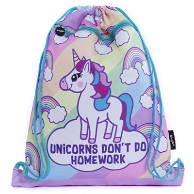KIDS AND TEENS DRAWSTRING BAG: Perfect for all purposes, this Fringoo drawstring bag is big enough to carry everything you could possibly need in the busy life of a young person. Whether kid, tween, or teen - whether swimming, sleeping overnight, or heading off to football or dance training, a large drawstring bag is what you need to show off your style in bright pastel colour. Available in a variety of cool designs, our range is designed with all kinds of kids in mind. UNICORN HOMEWORK DESIGN: This sassy slogan says it all! If you love unicorn accessories, and would rather go adventuring than do homework, you've found your perfect match in this bag. If you're looking for gifts for girls who love unicorns, this is the ultimate choice. Featuring large multicolour unicorn and mini rainbows on a rainbow stripe background, paired with a funny homework slogan. LARGE CAPACITY AND USE: Large enough to fit all of your holiday essentials or school supplies, this drawstring bag is big enough to fit your every need. The zipped front pocket works well for shoe storage, for use as a beach bag, gym bag, or kids swim bag. Adventurers of all shapes and sizes, this is a backpack that can fit your needs! The soft form material makes this bag perfect for carrying small or large amounts without bulkiness, and works especially well for days out and travel. DURABLE STRONG MATERIALS: Made from polyester that's tough and strong, soft to the touch, and super lightweight, this bag is perfect for young people who love to explore and play. The large capacity is big enough to hold everything kids need for day to day use, and the zipped front pocket provides security and extra space. Adjustable cord straps and drawcord closure are simple and safe for kids of all ages and provide easy, quick access for kids and parents on the go. DRAWSTRING BAGS IN ALL AESTHETICS: Whether you're unicorn obsessed, a dino-loving dude, or a wannabe superhero, there is something in this Fringoo range of drawstring bags for you. Created with kids, tweens, and teens in mind, we cater to all individual styles and personalities, offering kids the opportunity to express themselves through their accessories. Shop the full range of drawstring bags and find your perfect travel bag, swimming bag, overnight bag, and more!