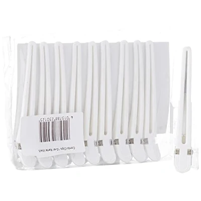 Universal clip for holding and dividing hair 9.5 cm long Lower section made of aluminium Available in 10-pack cards Colour: White