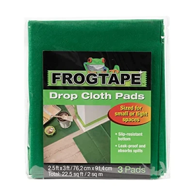 AmazonDesigned specifically with small spaces in mind, FrogTape Drop Cloth Pads make it easy to protect your floors and surfaces when painting. The leak-proof material protects the floors below, while the slip-resistant bottom holds the pad in place. Provides a safer surface for standing and working. The drop cloth pads are also a great spot to place your paint or other supplies and can be easily moved around any room. 3 cloths supplied per pack. Included Components: 3 x Frogtape Drop Cloth Pads