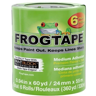General description FrogTape® Multi-Surface Painter’s Tape is a premium grade masking tape designed for various painting applications. Featuring medium adhesion, it removes cleanly from most surfaces for up to 21 days, and up to 7 days in direct sunlight. This green tape is ideal for both basic and advanced paint projects, ensuring crisp, clean lines. It is not recommended for use on freshly painted walls, wallpaper, or other delicate surfaces. Technical specifications Dimensions: 24mm x 55m Adhesion: Medium Pack size: 6 rolls Usage FrogTape® Multi-Surface Painter’s Tape is designed for use on a variety of surfaces, including: Cured painted walls Wood trim Glass Metal Stone For best results, remove the tape immediately after painting to achieve the sharpest lines possible. Other information Utilizes exclusive PaintBlock® Technology that reacts with the water in emulsion paint to form a micro-barrier, preventing paint bleed. Designed specifically for use with emulsion paint. Canister