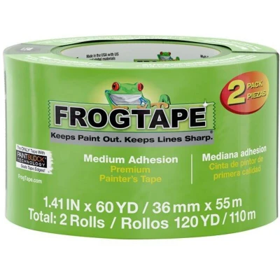 General description FrogTape® Multi-Surface Painter’s Tape is a premium grade masking tape designed for a variety of surfaces. Featuring medium adhesion, it removes cleanly from most surfaces for up to 21 days and seven days in direct sunlight. Ideal for both basic and advanced paint projects, it ensures crisp, clean lines, making it a must-have for any painting task. Technical specifications Dimensions: 36mm x 55m Adhesion: Medium Recommended for: Cured painted walls, wood trim, glass, metal, and stone Storage: Tape canister for clean, protected storage Usage FrogTape® is designed for use with emulsion paint. For best results, remove the tape immediately after painting to achieve the sharpest lines possible. Other information Features exclusive PaintBlock® Technology that reacts with the water in emulsion paint to form a micro-barrier, preventing paint bleed. Pack of 2 rolls. FrogTape® is the only painter’s masking tape treated with PaintBlock® Technology. Tagline: Keeps paint out,