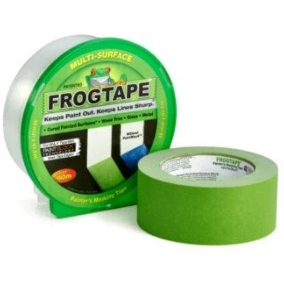 General description FrogTape® Multi-Surface Painter’s Tape is a premium grade masking tape designed for various painting projects. Featuring medium adhesion, it removes cleanly from most surfaces for up to 21 days and seven days in direct sunlight. This green tape is ideal for both basic and advanced paint applications, ensuring crisp, clean lines. Technical specifications Dimensions: 36mm x 55 metres Adhesion: Medium Removal time: Up to 21 days (7 days in direct sunlight) Usage Recommended for use on cured painted walls Suitable for wood trim, glass, metal, and stone Avoid use on freshly painted walls, wallpaper, and other delicate surfaces Other information Features exclusive PaintBlock® Technology that prevents paint bleed Edge-treated for sharp paint lines Includes a tape canister for clean, protected storage