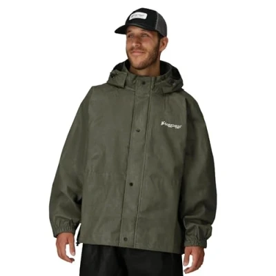 The Signature Bull Frogg Rain Jacket is designed with high-density fabric to provide increased puncture resistance making it perfect for the tough jobs Made with Frogg Toggs breathable, waterproof, wind-resistant, and lightweight material Jacket features an adjustable, tuck-away hood with E-Z Push cord locks and an open-waist design for greater versatility, performance and comfort The zippered front with snap-down storm flap keeps water out Zippered hand warmer pockets provide added comfort and storage.Raglan sleeves allow for superior range of motion