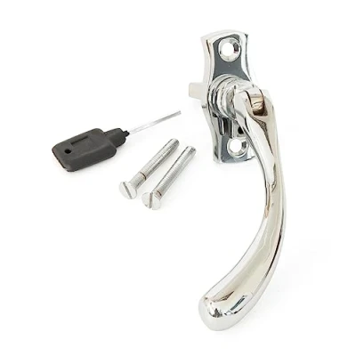 Espag cast window handle in a polished chrome finish. They can be fitted on any modern espagnolette rod or stand-alone centre lock. They have a 7mm x 40mm spindle and can be locked with a grub screw hidden under the handle., Manufacturer: From The Anvil