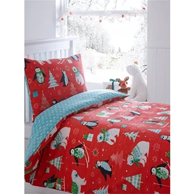AmazonFestive design includes pictures of penguins, polar bears and Christmas trees on a solid red background Contents: 1 x king size duvet cover (230 x 220 cm) and 2 pillowcases (50 x 75 cm) Materials: 50% polyester, 50% cotton Machine washable, can be tumble dried