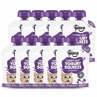 Frozzys Yogurt Squeeze Fermented Yoghurt with Prebiotics for Cats Lactose Free, 0% Fat, No Added Sugar. Lickable, Squeezable, Freezable Cat Treat. Natural Everyday 10x 85g Pouches