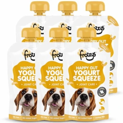 LICKABLE, SQUEEZABLE & FREEZABLE JOINT CARE TREAT: A fun, mess-free yogurt squeeze designed for daily joint support. Lick straight from the pouch, spread on lick mats, squeeze over food, or freeze for enrichment. Ideal for walks, training, or everyday functional feeding. TARGETED JOINT & MOBILITY SUPPORT: Made with chicken for high-quality protein, plus collagen and chondroitin to help support healthy joints and mobility. Turmeric provides additional joint-care benefits, making this a functional treat for active dogs and ageing companions. FERMENTED YOGURT WITH PREBIOTICS FOR GUT HEALTH: 90% lactose-free fermented yogurt combined with prebiotic fibre helps support digestion, nutrient absorption, and immune health. A dual-benefit treat that cares for joints while maintaining a healthy gut balance. LOW CALORIE, 0% FAT & GENTLE ON TUMMIES: With no added sugar and just 0.3% crude fat, this is a guilt-free daily treat suitable for dogs with sensitive stomachs or those on weight-managed diets. Delicious, nutritious, and easy to digest. SUITABLE FOR ALL DOGS FROM 12 WEEKS: Recommended daily feeding: small dogs (3kg) 60g, medium dogs (10kg) 115g, large dogs (>10kg) 230g. Resealable pouch keeps contents fresh and convenient at home or on the go. Refrigerate after opening/consume within 7 days.