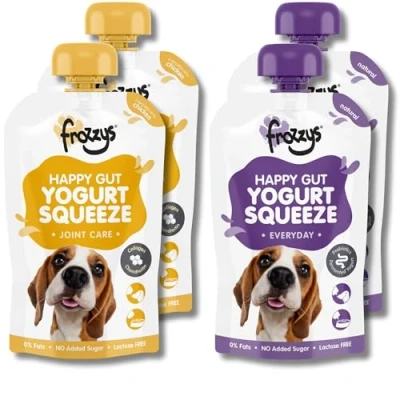 LICKABLE, SQUEEZABLE & FREEZABLE FUNCTIONAL YOGHURT TREATS: A mess-free taster pack with 4 resealable pouches (2 Joint Care Chicken + 2 Everyday Natural). Serve straight from the pouch, spread on lick mats, squeeze over food, use for training, or freeze for soothing enrichment at home or on the go. DUAL HEALTH SUPPORT – JOINT CARE & GUT GOODNESS: Combines targeted joint and mobility support with digestive and immune health. Joint Care includes chicken, collagen, chondroitin and turmeric, while Everyday Natural pouches deliver fermented yoghurt and prebiotic fibre for everyday wellbeing. FERMENTED, LACTOSE-FREE YOGHURT WITH PREBIOTICS: Made with lactose-free fermented yoghurt and prebiotic fibre to support digestion, nutrient absorption, hydration and a balanced gut microbiome. Gentle on sensitive stomachs while delivering functional daily benefits. LOW CALORIE, 0% FAT & NO ADDED SUGAR: A guilt-free daily treat suitable for weight-managed diets and dogs with delicate tummies. Naturally delicious, easy to digest and perfect as a daily snack, food topper or enrichment aid without excess calories. SUITABLE FOR ALL DOGS FROM 12 WEEKS & EASY STORAGE: Ideal for puppies, adult dogs and seniors of all sizes. Recommended daily feeding: small dogs (3kg) 60g, medium dogs (10kg) 115g, large dogs (>10kg) 230g. Resealable pouches keep contents fresh; refrigerate after opening and consume within 7 days.
