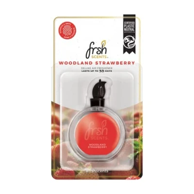 NATURAL MIX - The Woodland Strawberry Fragrance has a strong and natural sweetness. 3D FRSH SCENTS BOTTLE SHAPED OUTER - Modern aesthetic is a pleasure to display in the vehicle's interior. ENCLOSED SCENTED STONE CAPSULE - The central stone encapsulates the fragrance and slowly distributes it. DOUBLE SIDED DESIGN - Whichever way the cart swings it will always look good. Ideal for rear-view mirrors or hanging handles. PLASTIC NEUTRAL - Every sale of FRSH Scents product contributes to an average of 3 plastic bottles being collected and recycled. SCENT LIFESPAN - Up to 30 Days. DIRECTIONS FOR USE - Remove FRSH bottle air freshener from the sealed package. Hang freely using the attached string. Avoid placing air freshener on vinyl, carpet, plastic, leather, or varnished surfaces. Do not hang to obstruct the driver's view.