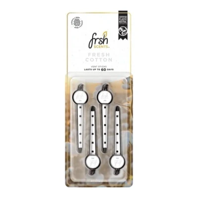 NATURAL MIX - Fresh Cotton is a cool clean fragrance delivering a refreshing odour neutralising scent as you drive. UNIVERSAL VENT FITTING - Simple to clip onto vertical or horizontal vents. PLASTIC NEUTRAL - Every sale of FRSH Scents product contributes to an average of 3 plastic bottles being collected and recycled. SCENT LIFESPAN - Up to 60 Days. DIRECTIONS FOR USE - Remove vent stick from package. Flip up top and insert into car vent. Wash hands thoroughly. Keep any unused vent sticks in the re-sealable package to extend life. Avoid placing air freshener on vinyl, carpet, plastic, leather or varnished surfaces