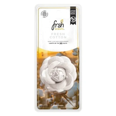 NATURAL MIX - Fresh Cotton is a cool clean fragrance delivering a refreshing odour neutralising scent as you drive. SOFT TOUCH FLOWER DESIGN - Beautiful flower design looks great on any vehicle dash. UNIVERSAL VENT FITTING - Simple to clip onto vertical or horizontal vents. PLASTIC NEUTRAL - Every sale of FRSH Scents product contributes to an average of 3 plastic bottles being collected and recycled. SCENT LIFESPAN - Up to 30 Days. DIRECTIONS FOR USE - Remove vent stick from the package. Flip-up top and insert into the car vent. Wash hands thoroughly. Keep any unused vent sticks in the re-sealable package to extend life. Avoid placing air freshener on vinyl, carpet, plastic, leather or varnished surfaces.