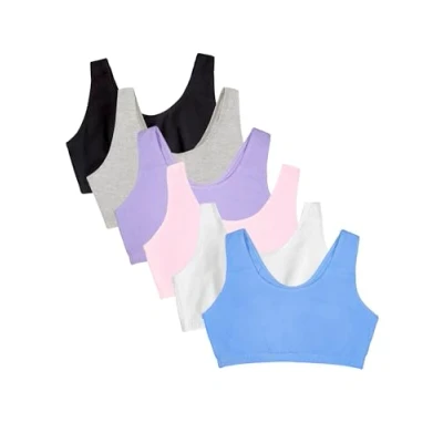 Lightweight and Comfortable: The Fruit of the Loom Women's Tank Style Cotton Sports Bras cotton pullover sports bras perfect for leisure or for the gym. Soft and Stretchy: These full coverage cotton sports bras have 2-ply construction that comfortably hug and support you while offering modesty without padding. Wire-free: These bras provide natural shaping and support without the discomfort of an underwire. Design: Wide strap bra design supports you throughout your day or during exercise without digging or pinching. Neckline scoops in the front of the bra. Scoop or racerback depending on color. Ultimate Comfort: With out bras, we've thought of everything including a tag-free and hardware-free design. No itchy tags or metal slides on these bras.