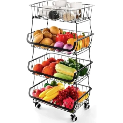 【4-Tier Fruit Basket】The fruit vegetable basket bins provide large storage space, which can support 80 lbs. A perfect storage solution for kitchen,bedroom, laundry room, playroom. Overall Size: 15.75" L x 12"W x 31.2"H 【Movable or Fixable】The kitchen storage fruit basket has 4 quality wheels(2 lockable) and 4 non-slip foot mats. 360 degree rotatable wheels help you move this rolling storage basket to wherever you want. 【Stackable Storage Basket】Each metal wire storage basket is stackable and detachable. Easy-to-install buckle fixing design allows you to freely combine the basket according to your needs. 【Durable and Stainless】Fruit basket made of thick steel wire and coated with anti-rust paint. The metal frame is easy to clean, non-toxic and harmless, strong and durable, not easy to deform. 【Keep Fresh &Tidy】Mesh grid design allows air to circulate, ensuring that the fruits and vegetables are ventilated and have no peculiar smell. The included drain tray prevents soiling of the kitchen or floor.