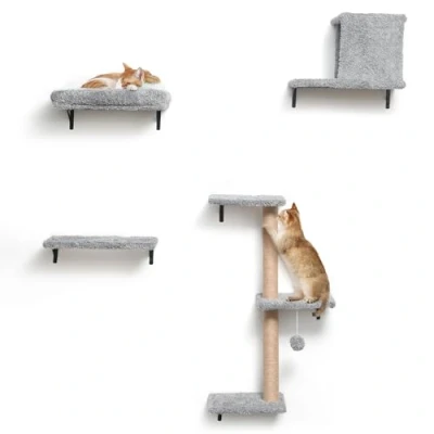 STABLE AND DURABLE - The cat wall furniture set is made of solid wood multi-layer board and pets friendly peach velvet fabric, not easy to bend and less fuzz shed. The fiber cross orientation of each wood layer forms many supporting point, making each cat shelf can bear more weight, passed FUKUMARU loading test. The safety of your cat is always our top priority. EASY TO INSTALL - The cat wall shelves are designed for US standard 16 inch drywall, through scientific arrangement, each bracket can be installed on the wood stud. Greatly reduced the complexity of the installation and increase the stability, even you are a fresh man for cat climbing wall installation, you won’t feel difficult. ONE FOR ALL FUNCTION - The wall mounted cat furniture set includes cat bridge, cat wall bed, cat scratching post and cat shelf, your cats can sleep, jump, scratch, and play with these pieces, one set for all different demands. You also can DIY your own cat jungle gym according to different moving line, countless fun for both you and your cats. SPACE SAVING - The multi-functional cat climbing shelves fully utilized home vertical space, saving your floor space. Your cats can play in their own climbing frame when you work or rest, consuming their energy thereby correcting bad behavior. Also it provides your cats a private territory away from your dog. STYLISH HOME DECOR - This cat walkway set has fresh color of green, it simulates outdoors lawn and natural tree, your cats can climb or jump in the activity place just like running through the wild jungle. It is also a decoration to embellish your room, perfect for window side, living room, bedroom, and other scene.