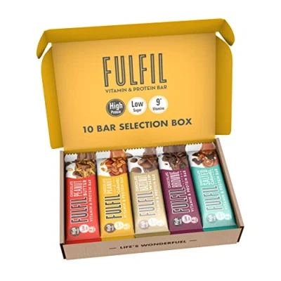 FIND YOUR FAVOURITES: Our Selection box features 2 each of our top five fan favourites including Chocolate Salted Caramel and Chocolate Peanut Caramel HIGH PROTEIN and LOW SUGAR BARS: Each 55g bar contains 20g of protein and less than 3g of sugar. Great for a tasty treat whenever you need it most SMARTER and TASTIER: Our bars contain less than 220 kcal. Our Selection box contains 10 bars, 2 of each of our top 5 best-sellers, so you can try them all 9 VITAMINS: Each FULFIL bar contains 30 percent RDA for 9 essential vitamins to support you through everyday life LIFE'S WONDERFUEL: We want FULFIL bars to fuel you on all of your everyday adventures, whether it’s to get you through your work day, hiking up a mountain, a workout, or a sofa snack we’ve got you covered