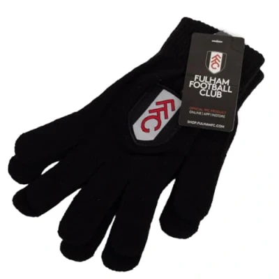 Fulham FC Knitted Gloves Junior. Children's black knitted gloves. Featuring a full colour Fulham club crest. Official licensed product. Size: Junior one size fits all | Packaging: With a swing tag