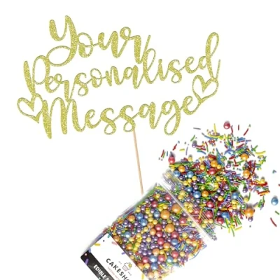 This Cakeshop Cake Decorating Pack includes 1 x 480gsm Double Sided Glitter Card Topper & 25g Cake Sprinkles (option to upgrade to 50g while customising) - perfect for your party or celebration! Cakeshop Sprinkles are Vegan, Gluten Free, Lactose free and Nut Free, all while looking amazing in striking colours and an assortment of sizes for a truly 'premium' finish Size: Sprinkles pack (perfect for a large cake) 25g, you can also upgrade to a 50g pack when customising your topper | Glitter Topper Approx 152mm (6") x 175mm (7") Toppers make a great keepsake to remember this special occasion forever, often our customers will remove the support sick and use on bedroom doors (until their next birthday!) Cakeshop Glitter Toppers are made from 480gsm premium double sided glitter card, select which colour topper you'd like then click 'Customise' to add your text personalisation and choose your sprinkles Choose from either Metallic or Rainbow sprinkles and upgrade to 50g packs in the 'Customise' section, so that you can match your sprinkles to your theme (or save them for next time!) All 'Cakeshop Cake Decorating Packs' come beautifully packed with simple to understand instructions so that you can quickly turn any cake, home made or shop bought (we wont tell!) into the perfect cake After you have added your custom information in the 'Customise Now' section our designers hand make your topper in the same font, style and topper colour as the design you've selected Cakeshop have been making the highest quality Cake Decorations since 2011 - we have thousands of design options available in our store for every occasion and theme (click 'visit the cakeshop store' above) It should go without saying - but Glitter Card toppers are flamable! We therefore recommend using only Acrylic toppers alongside candles for safety