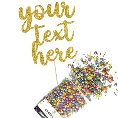 Fully Custom Premium Double Sided Glitter Card Cake Topper Sign & 25g Party Pack of Sugar Sprinkles for your Celebration Birthday, Anniversary, Leaving Decoration (Gold)