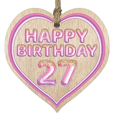 MAKE THEM SMILE WITH THIS BEAUTIFUL GIFT: This exceptional quality heart shaped wooden plaque shows the design: "Happy Birthday 27". If you are looking for funny thinking of you gifts for friends then then this hanging wooden heart is bound to make them smile. Not just for a women's 27th birthday presents also for men 27th birthday gifts for women friend. EVERY HEART IS TRUELY UNIQUE: Unlike other brands our beautiful plaques are made from raw wood and not a laminated MDF. This means that every single heart will have it's own pattern and indentation from the grain of the wood used. Each heart is hand finished with a lacquer varnish that really accentuates the the deep colour of the wood and also makes the ink of the pattern/text clearer and brighter in colour. WHAT DO YOU GET: This thoughtful presents for women is made from the highest quality wooden signs and plaques. Incredibly sweet cheer up positivity keepsake gifts for women and men from Stuff4 Ltd. MADE AND QUALITY CHECKED IN THE UK: We manufacture all our product right her in the UK so you can be sure of a fast turnaround and a product that is expertly made - mental health gifts, special friend gifts, miss you gifts for friends, positive gifts for women and birthday gifts for her or him. EASY TO HANG: The hanging wooden heart plaque comes equipped with a small jute twine, which can be then used to hang it on somewhere for decoration. The wooden sign is convenient for you to assemble without spending too much effort and time.