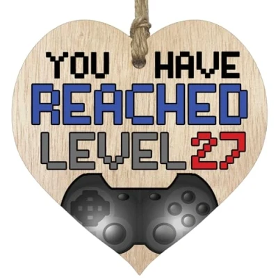 MAKE THEM SMILE WITH THIS BEAUTIFUL GIFT: This exceptional quality heart shaped wooden plaque shows the design: "You have reached level 27". If you are looking for funny thinking of you gifts for friends then then this hanging wooden heart is bound to make them smile. Not just for a women's 27th birthday presents also for men 27th birthday gifts for women friend. EVERY HEART IS TRUELY UNIQUE: Unlike other brands our beautiful plaques are made from raw wood and not a laminated MDF. This means that every single heart will have it's own pattern and indentation from the grain of the wood used. Each heart is hand finished with a lacquer varnish that really accentuates the the deep colour of the wood and also makes the ink of the pattern/text clearer and brighter in colour. WHAT DO YOU GET: This thoughtful presents for women is made from the highest quality wooden signs and plaques. Incredibly sweet cheer up positivity keepsake gifts for women and men from Stuff4 Ltd. MADE AND QUALITY CHECKED IN THE UK: We manufacture all our product right her in the UK so you can be sure of a fast turnaround and a product that is expertly made - mental health gifts, special friend gifts, miss you gifts for friends, positive gifts for women and birthday gifts for her or him. EASY TO HANG: The hanging wooden heart plaque comes equipped with a small jute twine, which can be then used to hang it on somewhere for decoration. The wooden sign is convenient for you to assemble without spending too much effort and time.