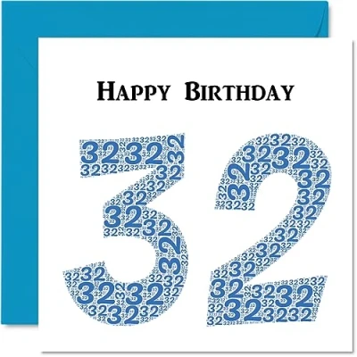 MAKE THEM SMILE WITH THIS FUN BIRTHDAY CARD: This exceptional quality birthday card for her or him shows the design "Happy Birthday 32". If you are looking for funny birthday cards for Woman, then then this happy birthday card is bound to make them laugh. Not just for friendship gifts for Woman this could also be for Best Friend, Work Colleague, Dad, Mum, Son, Daughter, Brother, Sister, Colleague, Uncle, Auntie, Cousin. WHAT DO YOU GET: The card is printed on one side and BLANK ON THE INSIDE to allow you to write your very own message. The unique fun design is printed on a specially sourced and environmentally responsible board. At 360 microns thick the natural white one-sided gloss board has a quality look and feel. Supplied with a coloured gummed envelope to complement the design and ready to be sealed and sent in the post. 32nd birthday card for him, birthday card for Dad. NO INK SMUDGES: There is nothing worse than writing inside a card to find that the shiny surface makes the ink smudge. This is why we use a high quality one sided coated board. The uncoated side will absorb more of the ink from your pen to make smudging a thing of the past. Dad birthday cards, best friend birthday card, birthday card funny, rude birthday cards for Woman. SIZES: Greeting Card = 145mm x 145mm, Envelope = 155mm x 155mm, Card Thickness = 360 micron. Great friend birthday cards, male birthday card, 32nd birthday card, happy birthday Mum cards, husband 32nd birthday cards, stepdad birthday card. MADE AND QUALITY CHECKED IN THE UK: We print and manufacture all our product right her in the UK so you can be sure of a fast turnaround and a product that is expertly made. Using environmentally responsible premium board our card is conscious of the responsible management of the world's forests - 32nd birthday cards for Men, Mens birthday cards, oldi card.