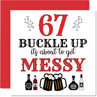 MAKE THEM SMILE WITH THIS FUN BIRTHDAY CARD: This exceptional quality birthday card for her or him shows the design "67 Buckle Up its about to get messy". If you are looking for funny birthday cards for Woman, then then this happy birthday card is bound to make them laugh. Not just for friendship gifts for Woman this could also be for Best Friend, Work Colleague, Dad, Mum, Grandad, Nanny, Grandma, Gran, Colleague, Uncle, Auntie, Cousin. WHAT DO YOU GET: The card is printed on one side and BLANK ON THE INSIDE to allow you to write your very own message. The unique fun design is printed on a specially sourced and environmentally responsible board. At 360 microns thick the natural white one-sided gloss board has a quality look and feel. Supplied with a coloured gummed envelope to complement the design and ready to be sealed and sent in the post. 67th birthday card for him, birthday card for Dad. NO INK SMUDGES: There is nothing worse than writing inside a card to find that the shiny surface makes the ink smudge. This is why we use a high quality one sided coated board. The uncoated side will absorb more of the ink from your pen to make smudging a thing of the past. Dad birthday cards, best friend birthday card, birthday card funny, rude birthday cards for Woman. SIZES: Greeting Card = 145mm x 145mm, Envelope = 155mm x 155mm, Card Thickness = 360 micron. Great friend birthday cards, male birthday card, 67th birthday card, happy birthday Mum cards, husband 67th birthday cards, stepdad birthday card. MADE AND QUALITY CHECKED IN THE UK: We print and manufacture all our product right her in the UK so you can be sure of a fast turnaround and a product that is expertly made. Using environmentally responsible premium board our card is conscious of the responsible management of the world's forests - 67th birthday cards for Men, Mens birthday cards, oldi card.
