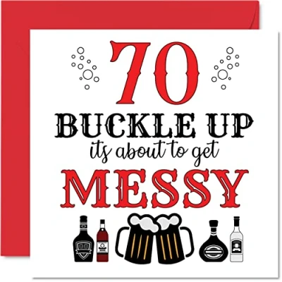 MAKE THEM SMILE WITH THIS FUN BIRTHDAY CARD: This exceptional quality birthday card for her or him shows the design "70 Buckle Up its about to get messy". If you are looking for funny birthday cards for Woman, then then this happy birthday card is bound to make them laugh. Not just for friendship gifts for Woman this could also be for Best Friend, Work Colleague, Dad, Mum, Great Grandad, Grandpa, Nanny, Grandma, Colleague, Gran, Uncle, Auntie. WHAT DO YOU GET: The card is printed on one side and BLANK ON THE INSIDE to allow you to write your very own message. The unique fun design is printed on a specially sourced and environmentally responsible board. At 360 microns thick the natural white one-sided gloss board has a quality look and feel. Supplied with a coloured gummed envelope to complement the design and ready to be sealed and sent in the post. 70th birthday card for him, birthday card for Dad. NO INK SMUDGES: There is nothing worse than writing inside a card to find that the shiny surface makes the ink smudge. This is why we use a high quality one sided coated board. The uncoated side will absorb more of the ink from your pen to make smudging a thing of the past. Dad birthday cards, best friend birthday card, birthday card funny, rude birthday cards for Woman. SIZES: Greeting Card = 145mm x 145mm, Envelope = 155mm x 155mm, Card Thickness = 360 micron. Great friend birthday cards, male birthday card, 70th birthday card, happy birthday Mum cards, husband 70th birthday cards, stepdad birthday card. MADE AND QUALITY CHECKED IN THE UK: We print and manufacture all our product right her in the UK so you can be sure of a fast turnaround and a product that is expertly made. Using environmentally responsible premium board our card is conscious of the responsible management of the world's forests - 70th birthday cards for Men, Mens birthday cards, oldi card.