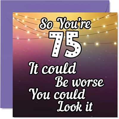 MAKE THEM SMILE WITH THIS FUN BIRTHDAY CARD: This exceptional quality birthday card for her or him shows the design "So you're 75 it could be worse you could look it". If you are looking for funny birthday cards for Woman, then then this happy birthday card is bound to make them laugh. Not just for friendship gifts for Woman this could also be for Best Friend, Work Colleague, Dad, Mum, Great Grandad, Grandpa, Nanny, Grandma, Colleague, Gran, Uncle, Auntie. WHAT DO YOU GET: The card is printed on one side and BLANK ON THE INSIDE to allow you to write your very own message. The unique fun design is printed on a specially sourced and environmentally responsible board. At 360 microns thick the natural white one-sided gloss board has a quality look and feel. Supplied with a coloured gummed envelope to complement the design and ready to be sealed and sent in the post. 75th birthday card for him, birthday card for Dad. NO INK SMUDGES: There is nothing worse than writing inside a card to find that the shiny surface makes the ink smudge. This is why we use a high quality one sided coated board. The uncoated side will absorb more of the ink from your pen to make smudging a thing of the past. Dad birthday cards, best friend birthday card, birthday card funny, rude birthday cards for Woman. SIZES: Greeting Card = 145mm x 145mm, Envelope = 155mm x 155mm, Card Thickness = 360 micron. Great friend birthday cards, male birthday card, 75th birthday card, happy birthday Mum cards, husband 75th birthday cards, stepdad birthday card. MADE AND QUALITY CHECKED IN THE UK: We print and manufacture all our product right her in the UK so you can be sure of a fast turnaround and a product that is expertly made. Using environmentally responsible premium board our card is conscious of the responsible management of the world's forests - 75th birthday cards for Men, Mens birthday cards, oldi card.