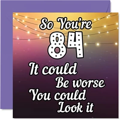 MAKE THEM SMILE WITH THIS FUN BIRTHDAY CARD: This exceptional quality birthday card for her or him shows the design "So you're 84 it could be worse you could look it". If you are looking for funny birthday cards for Woman, then then this happy birthday card is bound to make them laugh. Not just for friendship gifts for Woman this could also be for Best Friend, Work Colleague, Dad, Mum, Great Grandad, Grandpa, Nanny, Grandma, Colleague, Gran, Uncle, Auntie. WHAT DO YOU GET: The card is printed on one side and BLANK ON THE INSIDE to allow you to write your very own message. The unique fun design is printed on a specially sourced and environmentally responsible board. At 360 microns thick the natural white one-sided gloss board has a quality look and feel. Supplied with a coloured gummed envelope to complement the design and ready to be sealed and sent in the post. 84th birthday card for him, birthday card for Dad. NO INK SMUDGES: There is nothing worse than writing inside a card to find that the shiny surface makes the ink smudge. This is why we use a high quality one sided coated board. The uncoated side will absorb more of the ink from your pen to make smudging a thing of the past. Dad birthday cards, best friend birthday card, birthday card funny, rude birthday cards for Woman. SIZES: Greeting Card = 145mm x 145mm, Envelope = 155mm x 155mm, Card Thickness = 360 micron. Great friend birthday cards, male birthday card, 84th birthday card, happy birthday Mum cards, husband 84th birthday cards, stepdad birthday card. MADE AND QUALITY CHECKED IN THE UK: We print and manufacture all our product right her in the UK so you can be sure of a fast turnaround and a product that is expertly made. Using environmentally responsible premium board our card is conscious of the responsible management of the world's forests - 84th birthday cards for Men, Mens birthday cards, oldi card.